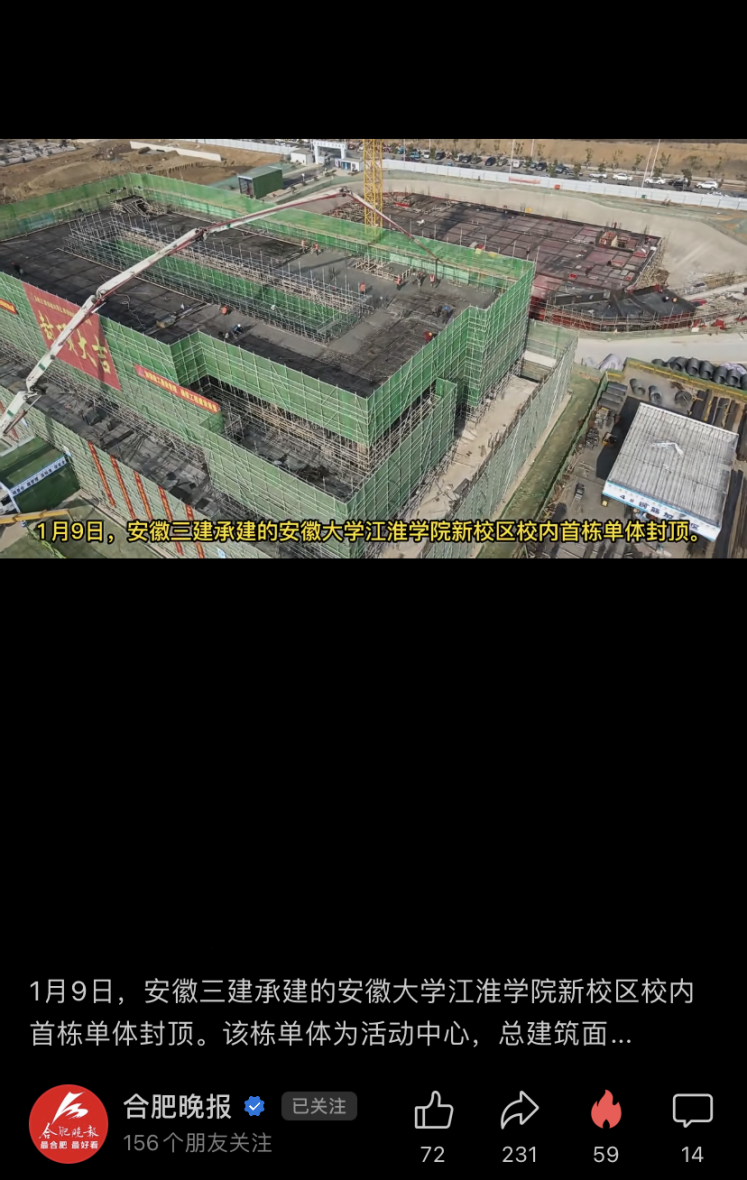媒體聚焦丨合肥晚報(bào)視頻號、江淮晨報(bào)報(bào)道公司承建的安徽大學(xué)江淮學(xué)院新校區(qū)項(xiàng)目最新進(jìn)展
