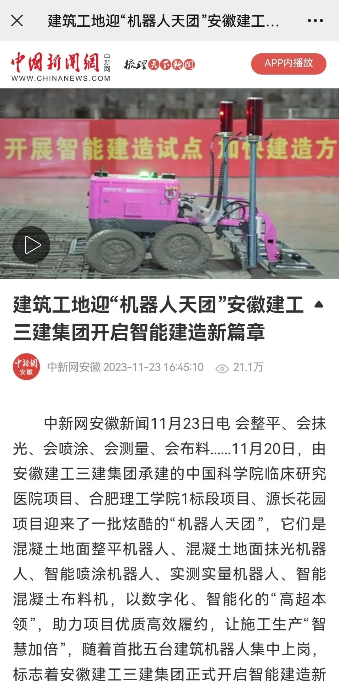 11月23日,中新網(wǎng)、安徽國(guó)資、合肥晚報(bào)以“建筑工地迎‘機(jī)器人天團(tuán)’安徽建工三建集團(tuán)開(kāi)啟智能建造新篇章”為題,專(zhuān)題報(bào)道公司首批引進(jìn)五臺(tái)建筑機(jī)器人助力項(xiàng)目高質(zhì)量建設(shè),開(kāi)啟智能建造新篇章,受到廣泛關(guān)注。截至發(fā)稿時(shí),閱讀量已超20萬(wàn)次。