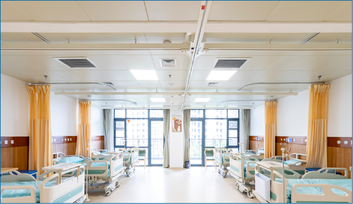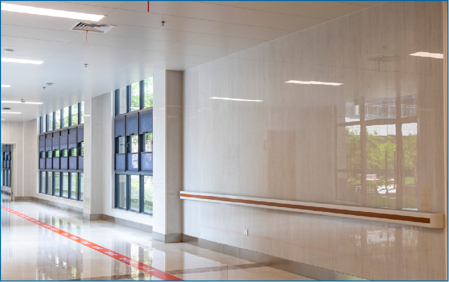 設計上,摒棄了傳統醫院病房樓的直通式走廊,形成類似“街道+廣場”的空間,成為充滿生活氛圍的社區交往空間,延續家居感覺。根據不同使用人群(失能、失智老年人、自理老人)的需求,設置不同的配套服務功能,以康養軸連接南、北、中部各功能模塊,利用無障礙人行通道形成風雨無阻的步行系統。設置智能適老化看護管理系統和無障礙智能載人天軌系統,施工策劃全面考慮運營需求,確保系統平穩運行且無交叉、無干擾。