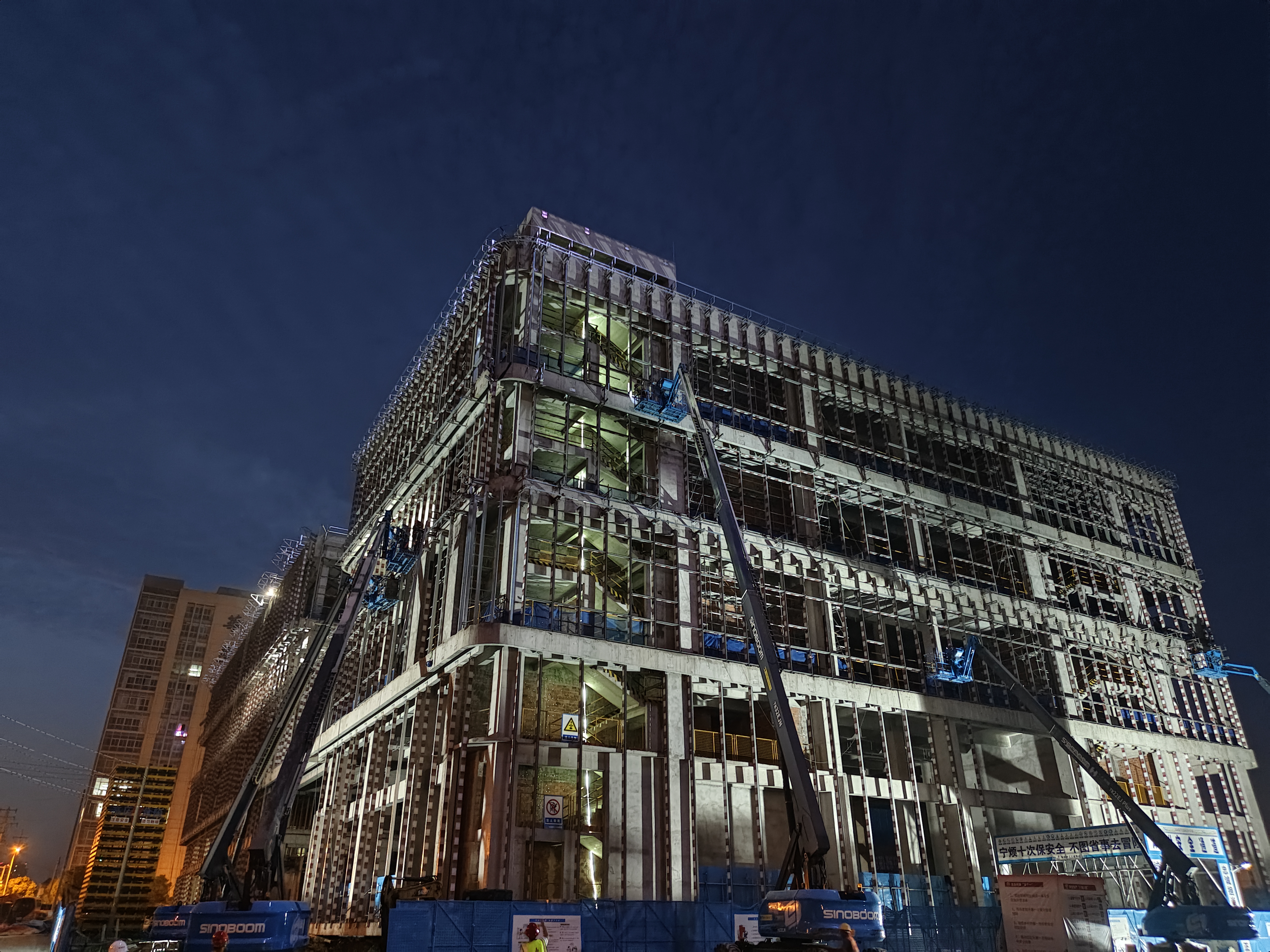 面對6月30日A-3#樓展廳開放的關鍵節點,項目部啟動“軍令狀”攻堅模式:將施工藍圖轉化為每日作戰圖,簽訂責任狀23份,召開進度協調會46次。通過科學高效的輪轉作業模式,項目在4月30日率先實現A-3#樓封頂,目前,幕墻施工已完成75%。與此同時,A-2#、A-4#樓幕墻施工進度已達40%,A-1#樓幕墻基礎施工全面展開。
