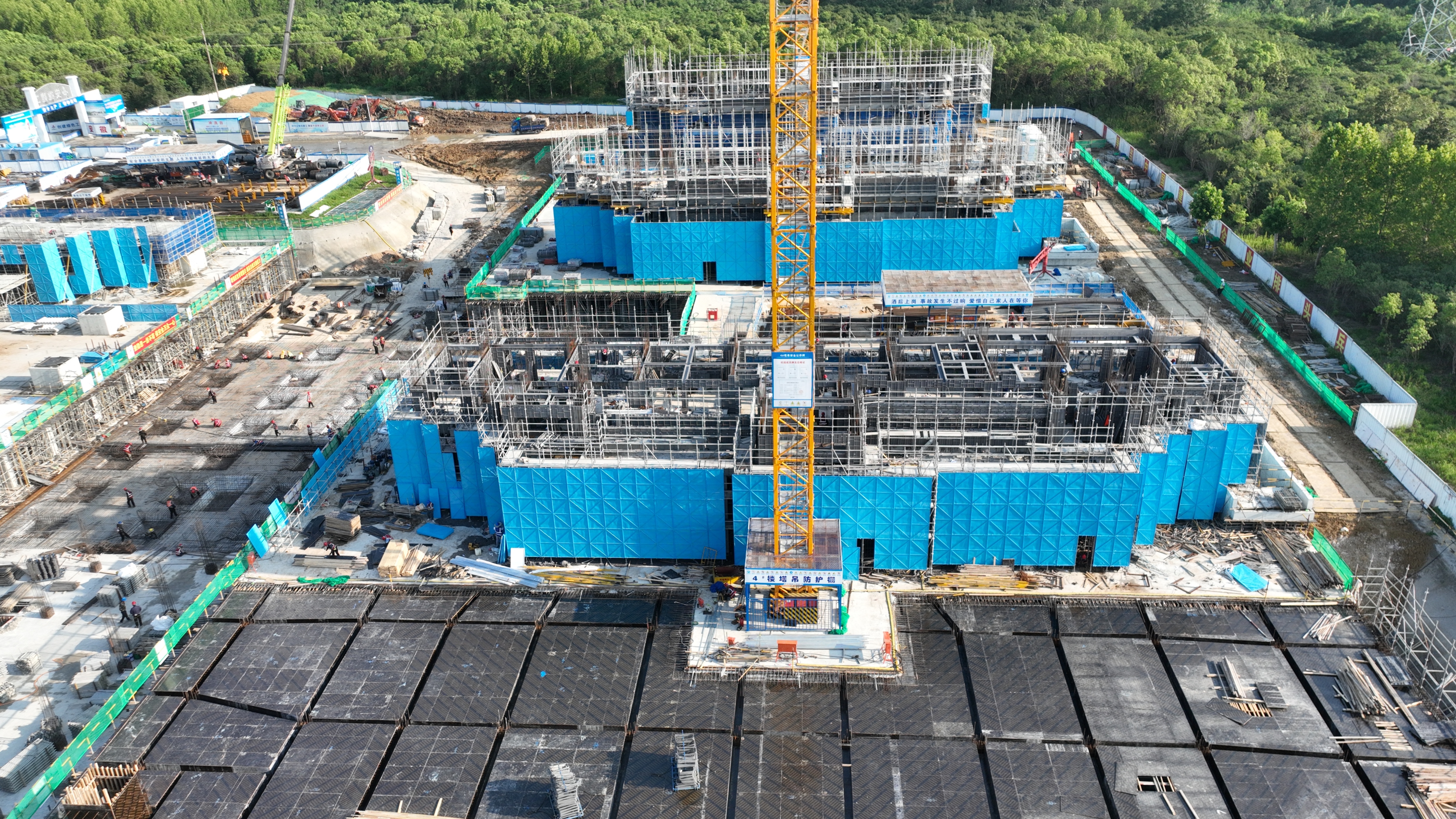 地庫4區頂梁板鋼筋綁扎完成75%;地庫5區正進行頂梁板模板鋪設;地庫2區正進行頂梁板模板鋪設;地庫6區北側內架搭設完成;地庫7區、6區南側正進行防水施工。