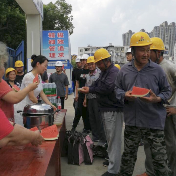近期連日高溫炎熱,驕陽似火,酷暑難耐。安徽三建十公司蜀山區(qū)動力三村改造項目一線施工人員依然堅守在各自崗位。“你為我筑高樓大廈,我為你送綠豆甜瓜”。三建人揮汗奮戰(zhàn)的精神,感動了當(dāng)?shù)厣鐓^(qū)百姓。2019年7月25日下午三時,七里塘社區(qū)黨委副書記孫妹娟組織號召社區(qū)8名志愿者集中前往動力三村改造項目的施工現(xiàn)場開展“送清涼”活動,安徽三建十公司支部書記吳明寬、安全科長張玉保、項目經(jīng)理李其云等人員參加活動。
