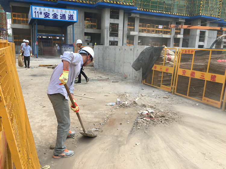 此次黨員義務勞動的主要任務是清掃項目部11棟與16棟樓之間等區域的的墻面、地面清掃,定型化材料整理。盡管太陽毒辣、天氣炎熱,但大家在項目黨支黨員的帶領下,全體管理人員熱情高漲,大家自動分工,相互協作,積極投身到熱火朝天的義務勞動行動中,勞動的身影在項目上成了一道亮麗的風景線。